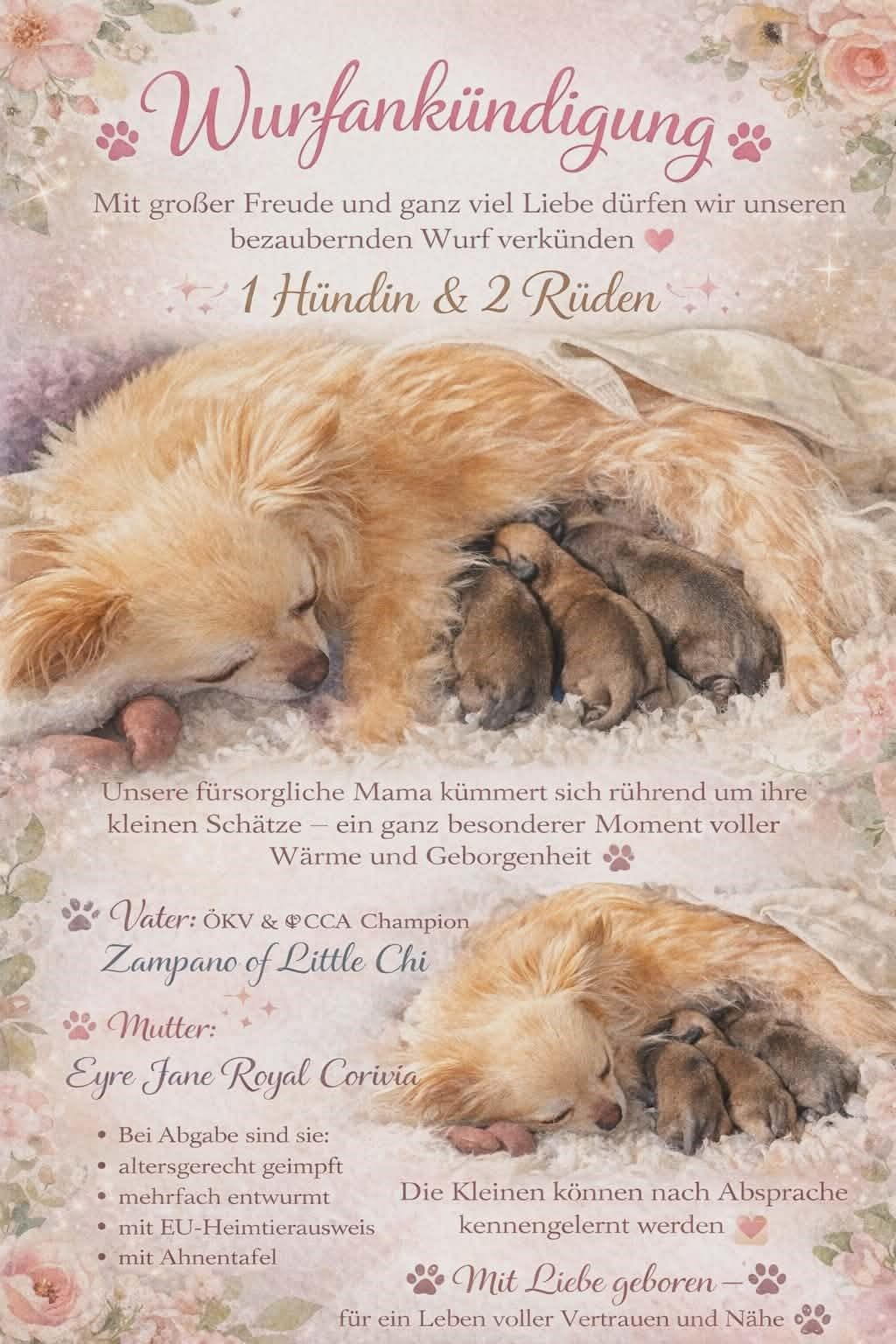 Unser ÖKV & CCA CH. Zampano of little Chi und unsere CCA J Ch. Eyre Jane Royal Corivia aka JAMIE sind Eltern von 3 bildhübschen Welpen geworden!